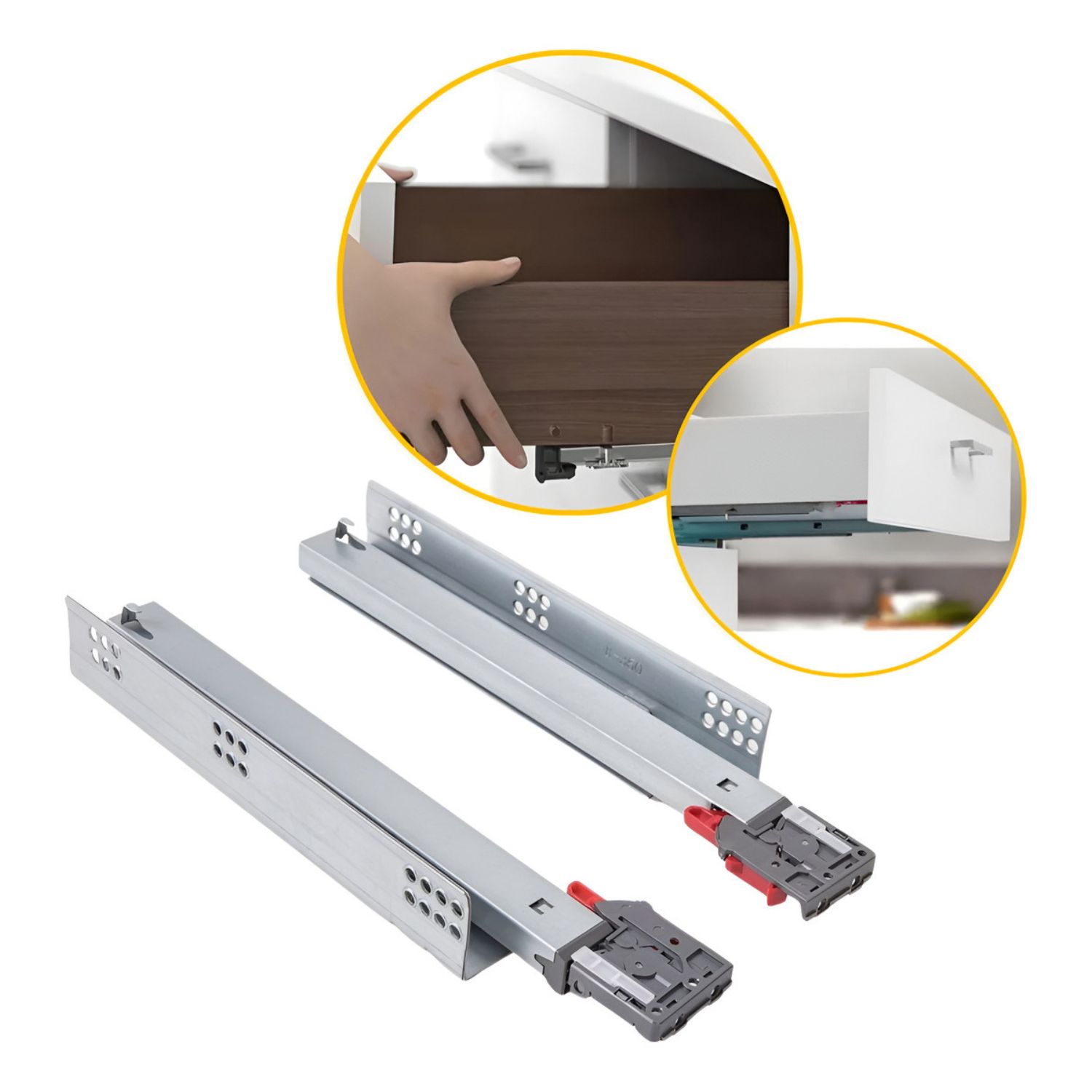 Possui sistema Soft Closing (Gaveta aberta, fecha no amortecimento) seguro e sem ruídos, ideal para gavetas de armários, escrivaninhas, cômodas e móveis compactos.